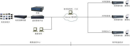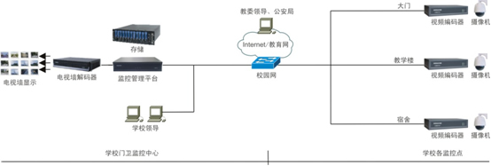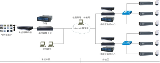 大多高校、部分中學的監(jiān)控規(guī)模大,且本身即為投資主體,因此通常采用以自身為中心的組網(wǎng)架構(gòu)。門衛(wèi)作為監(jiān)控中心,配置管理平臺、存儲以及電視墻,監(jiān)控點位于各教學樓、宿舍、食堂、圖書館、操場、車庫等場所。監(jiān)控點與平臺之間通過校園網(wǎng)相連。學校領(lǐng)導(dǎo)可通過PC訪問監(jiān)控圖像,教委領(lǐng)導(dǎo)可通過Internet或教育網(wǎng)遠程訪問監(jiān)控圖像。組網(wǎng)方式如下圖所示。