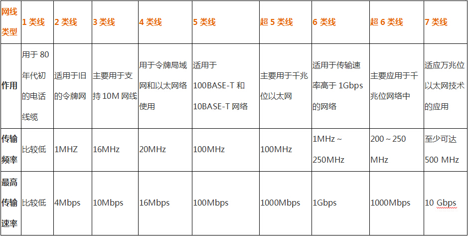 雙絞線常見(jiàn)的有3類線,5類線和超5類線、6類線,以及最新的7類線。前者線徑細(xì)而后者線徑粗,型號(hào)如下: