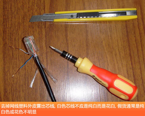 這一步只需用剪刀去掉一小截線外面的塑料包皮,使露出4對(duì)芯線。在這里我們還是通過(guò) “看”的方法來(lái)進(jìn)一步判別,真5類/超5類線4對(duì)芯線中白色的那條不應(yīng)是純白的,而是帶有與之成對(duì)的那條芯線顏色的花白,這主要是為了方便用戶在制作水晶頭時(shí)區(qū)別線對(duì)。而假貨通常是純白色的或者花色不明顯。還有一點(diǎn)就是4對(duì)芯線的繞線密度,真5類/超5類線繞線密度適中,方向是逆時(shí)針。假線通常密度很小,方向也可能會(huì)是順時(shí)針(比較少),這主要是因?yàn)樵谥谱鞣矫姹容^容易,這樣生產(chǎn)成本也就小了。